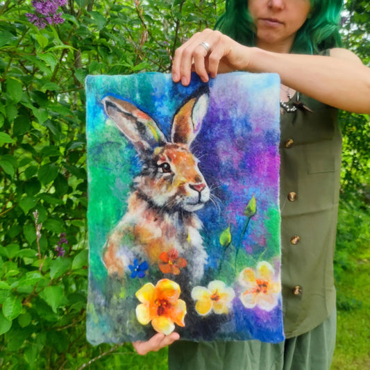 Wool Painting ”Summer Joy in the Company of a Hare”, from the Whimsical Wildlife in Bloom collection