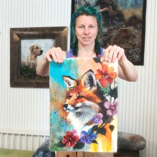 Wool Painting ”Fox in an Enchanting Sea of Flowers”, from the Whimsical Wildlife in Bloom collection