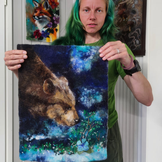 Wool Painting ”Enchanted by the Blue Bloom”, from the Whimsical Wildlife in Bloom collection